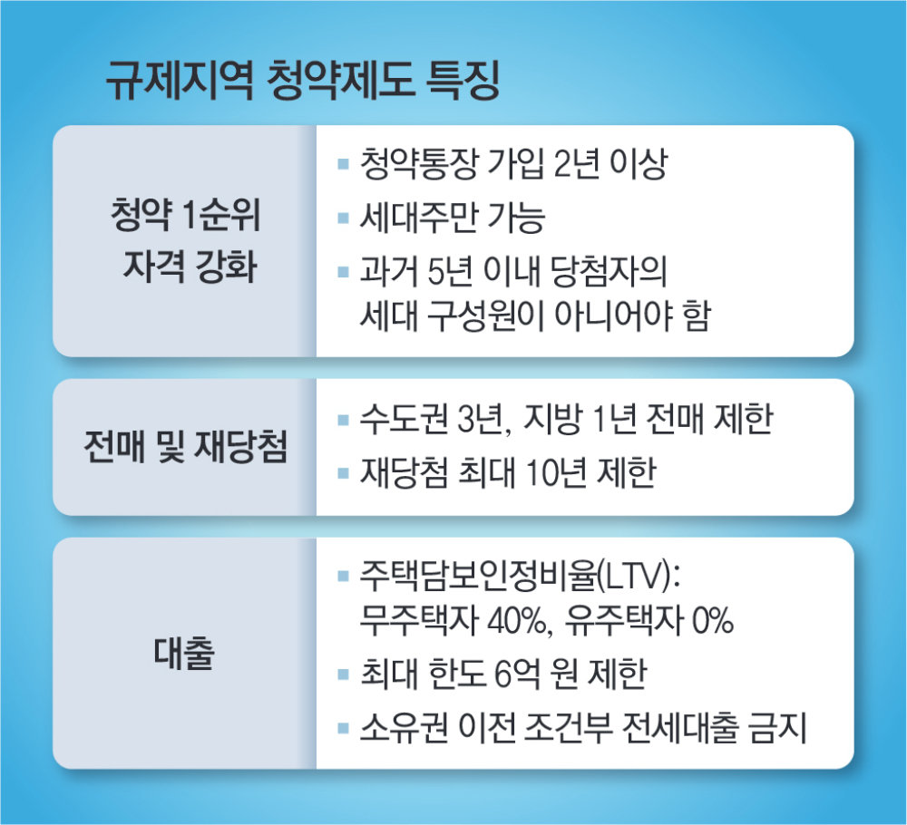 “규제 지역은 1순위 청약 자격을 갖추기가 더 까다로운데요, 우선 청약통장 가입 후 2년이 지나야 하고, 세대주에게만 자격이 주어집니다. 비(非)규제 지역에서는 부부의 경우 두 사람 모두 청약 신청을 할 수가 있지만, 규제 지역에서는 세대주인 한 사람만 1순위로 신청할 수 있습니다. 또 세대주와 세대원 중에 과거 5년 내에 청약에 당첨됐던 사람이 없어야 한다는 조건도 있습니다. 해당 지역에서 2년 이상 거주한 사람에게 우선 공급됩니다.