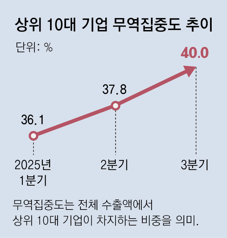 10일 국가데이터처가 발표한 기업 특성별 무역통계(잠정)에 따르면 올 3분기 상위 10대 수출 기업의 무역집중도는 40.0%로 집계됐다. 1년 전보다 2.6%포인트 오르며 관련 통계가 작성된 2015년 이후 최고치를 보였다. 3분기 전체 수출액은 2010년 통계 작성 이래 최대 규모인 1850억 달러로 나타났는데 이 중 40%를 삼성전자, SK하이닉스 등 주요 수출 기업이 차지한 것이다.