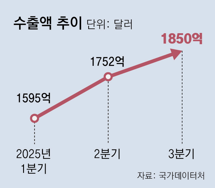 3분기 수출이 증가한 데에는 슈퍼사이클에 접어든 반도체의 영향이 컸다. 자본재 수출액은 전년 동기 대비 11.2% 늘어난 1110억 달러로 나타났다. 8개 분기 연속 증가세를 이어가며 역대 최대치를 달성했다. 특히 반도체 수출액(464억 달러)이 26.4% 급등했다.