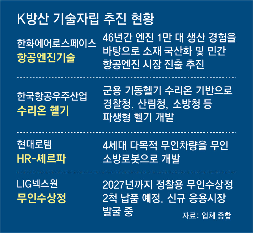 이처럼 방산 기술 자립이 민간 경제 활성화로 이어지면서, 한국은 ‘무기 수출국’을 넘어 ‘방산 기술 강국’으로 도약하고 있다. 장원준 전북대 첨단방위산업학과 교수는 “기술 독립이 이루어지지 않으면 주도적인 방위산업 육성이나 수출이 불가능하다”며 “인공지능(AI), 드론 같은 첨단 기술 개발에 속도를 내야 할 것”이라고 강조했다.