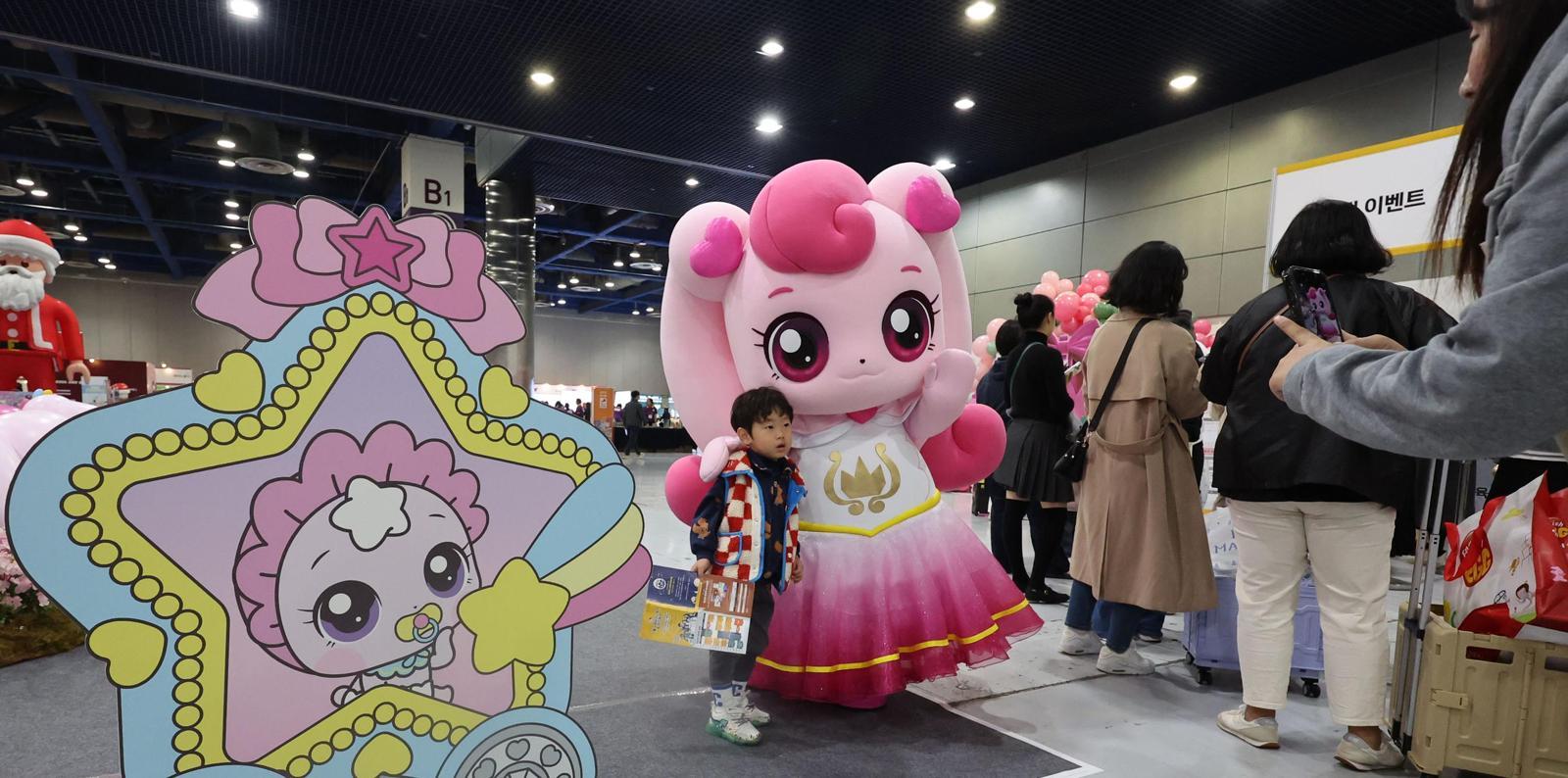 13일 서울 강남구 코엑스에서 열린 서울국제유아교육전·키즈페어에서 한 어린이가 캐릭터 티니핑과 함께 기념 촬영을 하고 있다. 16일까지 열리는 전시회에는 영유아 교육과 라이프스타일 관련 600개 부스가 참여한다.