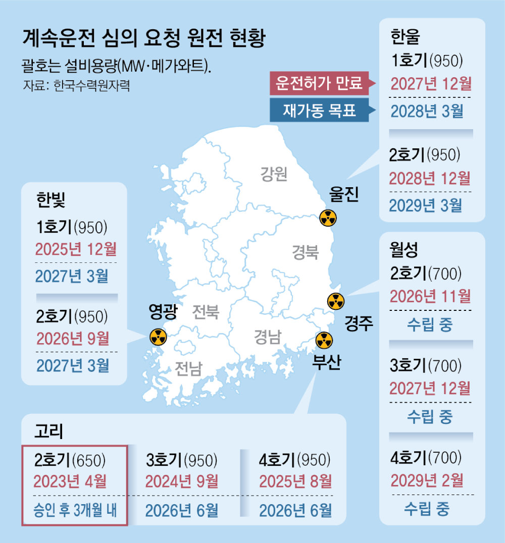고리 2호기를 포함해 2030년 이전에 운전허가가 만료되는 원전 10기의 연간 발전량은 59.7TWh(테라와트시)로 지난해 서울의 연간 전력 사용량(50.4TWh)을 웃돈다. AI 관련 업계는 전력 수요 급증에 원전 계속운전이 필요하다는 입장이었다. 당장 엔비디아로부터 공급받기로 한 그래픽처리장치(GPU) 26만 장을 가동하기 위해서는 대형 원전 1기(1000MW)분의 전력량이 추가로 필요하기 때문이다.