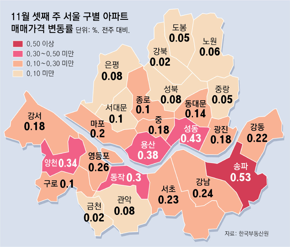 특히 10·15 대책 전부터 규제지역이었던 강남 3구와 용산구에서 모두 상승 폭이 커졌다. 송파구는 전주(0.47%)보다 0.53% 오르며 25개 자치구 중 가장 큰 폭으로 올랐다. 이어 용산(0.38%), 강남(0.24%), 서초구(0.23%) 순이었다.