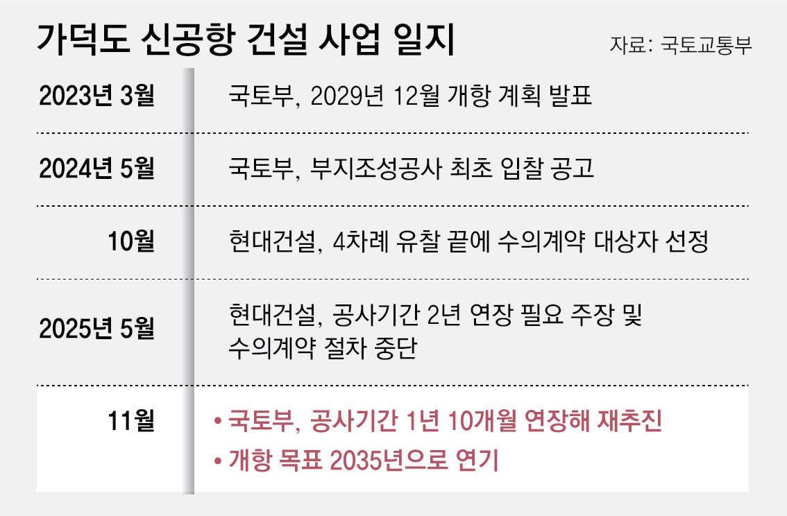 2024년 5월부터 입찰 공고를 진행했지만 4차례 유찰됐고 그해 10월 현대건설 컨소시엄이 수의계약 대상자로 선정됐다. 현대건설은 5월 추가 공사기간 24개월(2년)이 필요하다는 의견을 제시했으나 받아들여지지 않자 결국 사업을 포기했다. 국토부가 이번에 공사 일정을 1년 10개월 연장한 것은 현대건설의 요구를 대폭 수용한 셈이다. 이에 따라 무리하게 개항을 앞당기려다가 오히려 3년 이상을 허송했다는 비판이 나온다.
