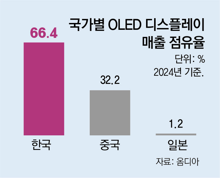 디스플레이 업계는 현재 중국 LCD 대 한국 OLED 구도로 경쟁이 벌어지고 있다. LG디스플레이가 올 초 중국 광저우 LCD 공장을 매각하며 TV용 LCD 패널은 사실상 중국 독점 체제가 됐다. 업계 관계자는 “한국이 경쟁 우위를 가져갈 방법은 OLED뿐”이라며 “국내 자체 공급망 강화에 더 많은 투자를 쏟아 중국 등 해외 경쟁사와의 격차를 벌려야 한다”고 했다.