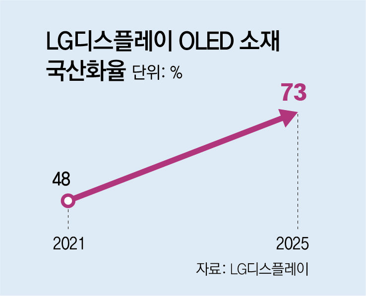 LG디스플레이가 유기발광다이오드(OLED) 소재 국산화율을 70% 이상으로 끌어올리며 자체 공급망 구축에 속도를 내고 있다. 4년 전만 해도 절반이 안 됐던 국산화율을 지속해서 높이며 공급망 안정성뿐만 아니라 가격 경쟁력까지 높이고 있다.