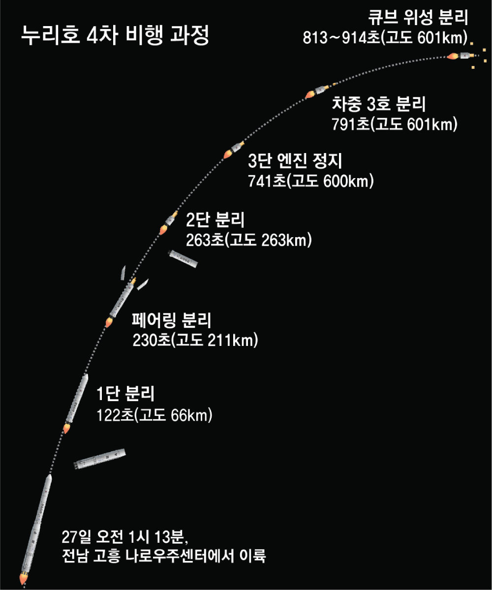 한국형 발사체 누리호는 27일 오전 1시 13분 나로우주센터에서 굉음을 내며 발사됐다. 아파트 17층 높이에 해당하는 47.2m의 거대 발사체인 누리호는 300t의 추력을 내며 발사대 인근을 환하게 밝혔다. 발사한 지 122초 후 고도 65.7km에서 1단 분리, 230초 후에 위성을 탑재한 3단을 감싸고 있던 페어링 분리, 263초 후 2단 분리까지 정상적으로 진행됐다.