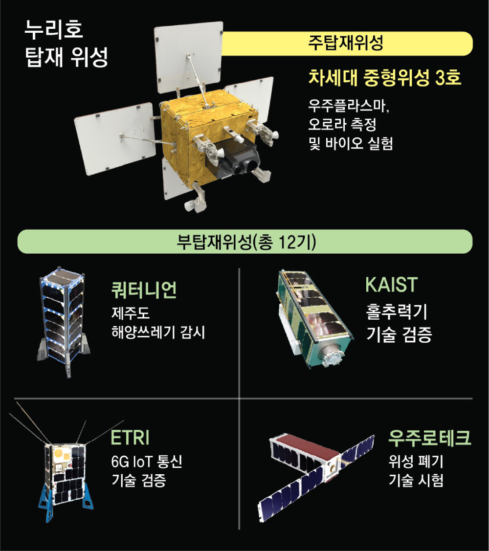 누리호 4호기에 실린 960kg 중량의 위성 13기도 발사 791초 후 차중 3호를 시작으로 모두 정상적으로 사출됐다. 차중 3호는 남극세종기지 지상국, 대전 항우연 지상국, 그리고 노르웨이에 있는 미국 항공우주국(NASA) 지상국 등 총 세 곳에서 모두 교신에 성공했다.