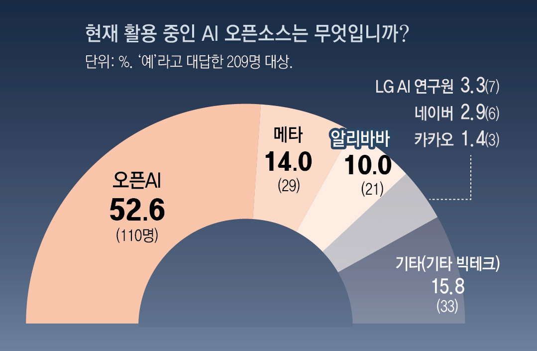 반면 미중 AI 패권 경쟁 속에 국내 사용자들의 해외 AI 모델에 대한 의존도는 점차 심화되고 있다. 동아일보가 국내 기업 및 기관 정보기술(IT) 담당자 300여 명의 AI 사용 실태를 설문조사한 결과 오픈AI의 GPT 모델을 사용한다는 응답이 52.6%로 절반을 넘겼다. 국내에서 개발한 모델을 사용한다는 응답은 채 10%도 되지 않았다.