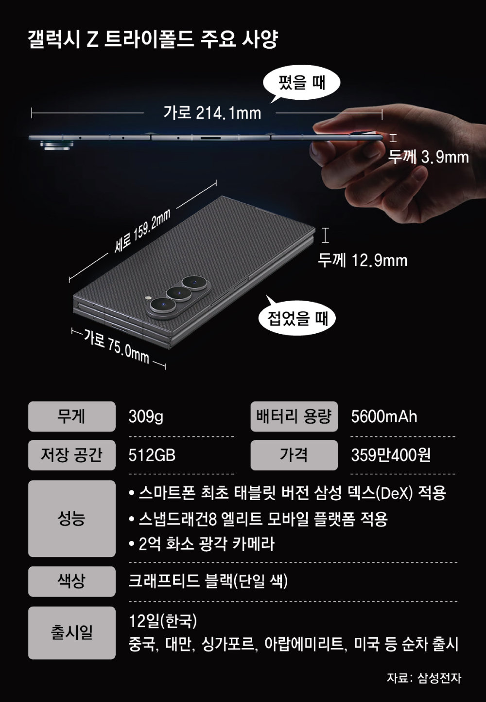 트라이폴드의 모바일 프로세서(AP)는 ‘갤럭시용 스냅드래건 8 엘리트 모바일 플랫폼’으로 구동된다. 2억 화소 광각 카메라를 탑재했다. 역대 갤럭시 폴더블 시리즈 중 가장 큰 5600mAh 용량의 배터리를 탑재했다. 최대 45W 초고속 충전도 지원한다. 20만 회의 ‘멀티 폴딩 테스트’도 통과했다. 이 제품을 약 5년 동안 하루 100회 접었다 펴도 버틴다는 의미다.