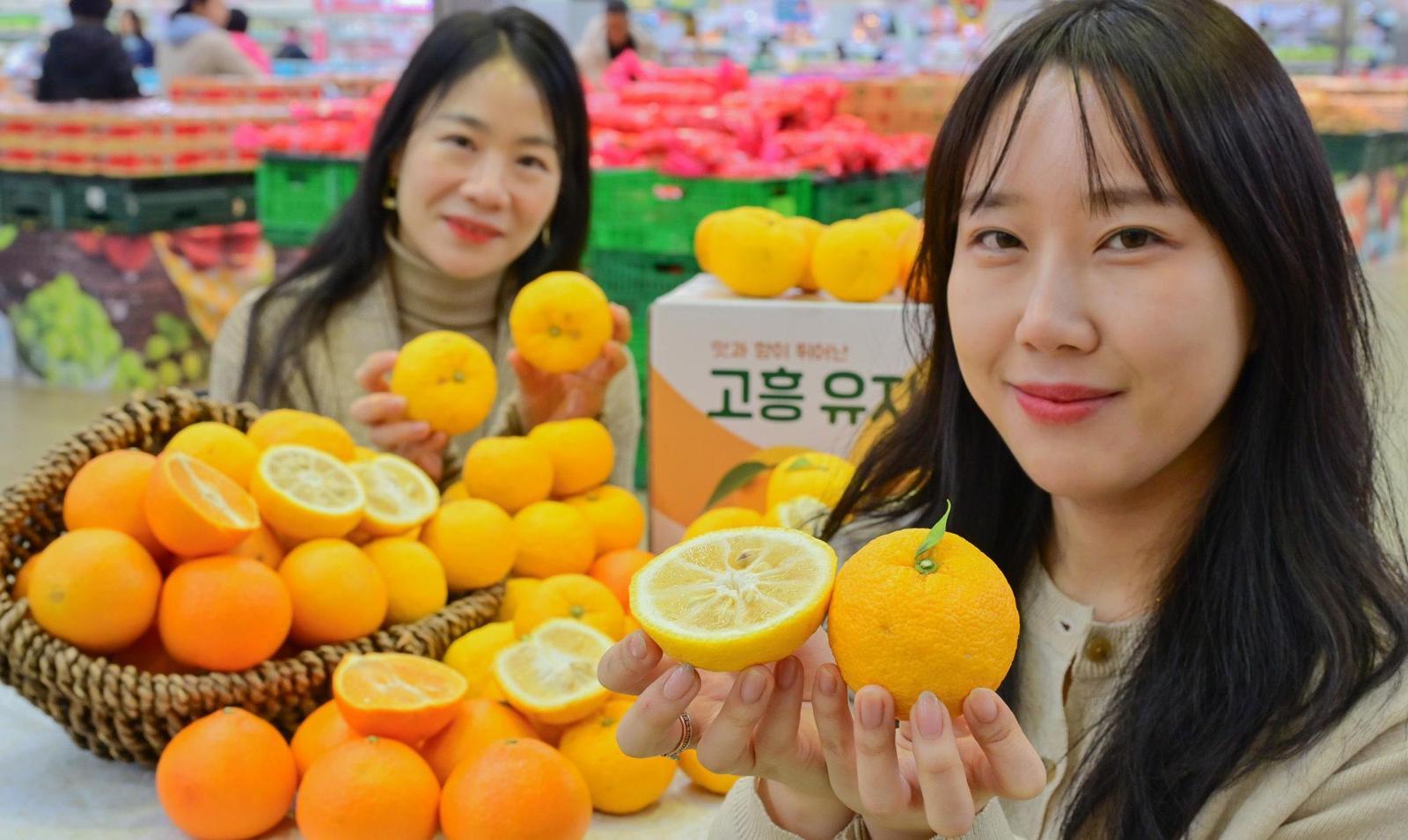 2일 서울 서초구 하나로마트 양재점에서 모델들이 황금향·유자 등 만감류와 감귤을 소개하고 있다. 이날 농협유통은 겨울철 건강 관리에 좋은 황금향과 유자를 판매한다고 밝혔다.