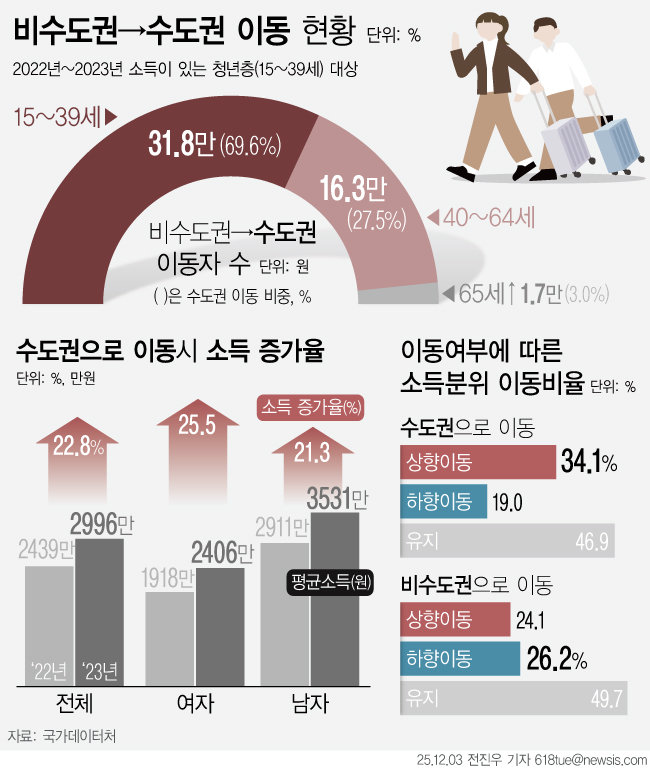 3일 국가데이터처에 따르면 청년층이 수도권으로 이동할 경우 소득이 평균 20% 이상 증가하는 반면, 수도권에서 비수도권으로 이동한 청년층은 소득 증가 효과는 미미한 것으로 나타났다. 2022년 2439만원이던 비수도권 거주 청년의 평균 소득은 2023년 수도권으로 진입하면서 2996만원으로 늘어났다. 소득증가율은 22.8%에 달했다. 서울=뉴시스
