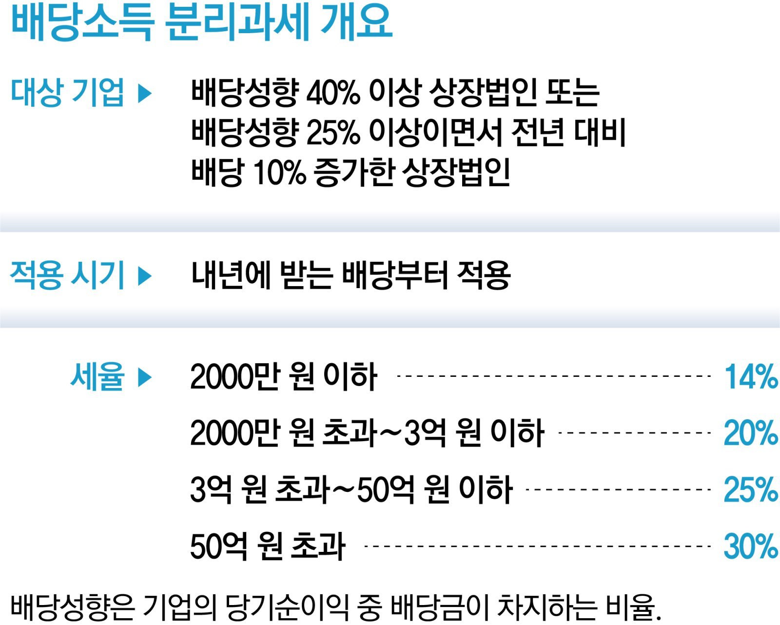 중요한 점은 모든 주식이 해당 제도의 적용을 받진 않는다는 데 있다. ‘고배당 상장 주식’에 투자해 받은 배당에 대해서만 분리과세 혜택이 주어진다. 고배당 상장 주식이란 △배당성향(당기순이익 대비 배당금 비율) 40% 이상 또는 △배당성향 25% 이상이면서 전년보다 배당을 10% 이상 늘린 상장법인의 주식을 말한다.