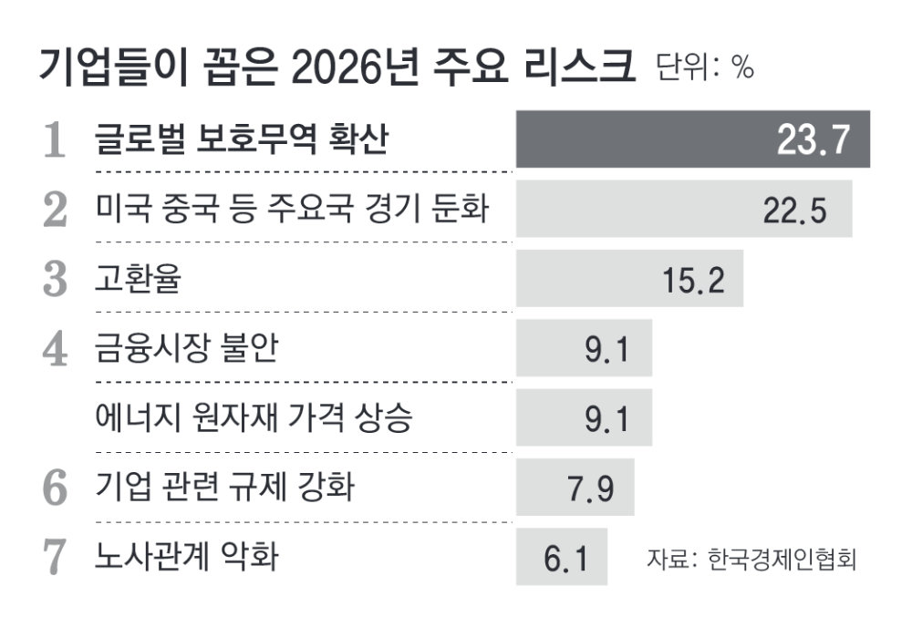 국내 대기업들은 내년에 생길 수 있는 주요 경영 리스크로는 글로벌 보호무역 확산(23.7%)과 주요국 경기 둔화(22.5%), 고환율(15.2%), 금융시장 불안(9.1%) 등을 꼽았다. 상당 부분이 투자를 줄이는 이유와 겹친다. 철강업체인 C사 관계자는 “이미 글로벌 전략 회의까지 마쳤지만 내년도 경영계획은 수정할 폭이 넓을 것으로 본다”며 “미국발 관세 리스크가 전 세계로 퍼지고 있어 통상 문제를 더 민감하게 지켜봐야 하는 상황”이라고 설명했다.