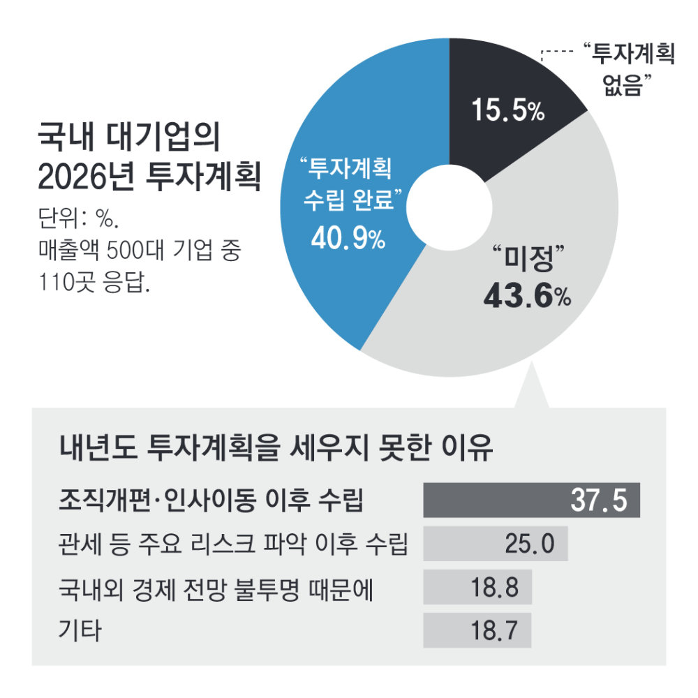 7일 한국경제인협회가 매출액 500대 기업을 대상으로 조사한 2026년 투자계획에 따르면 응답에 나선 110개 기업 가운데 59.1%가 내년도 투자계획을 아직 수립하지 못하거나(43.6%) 투자계획이 없다(15.5%)고 답했다. 연말에 가까운 지난달 24일까지 주요 대기업만을 대상으로 진행한 조사였지만 상당수 기업이 경영 측면에서 ‘시계 제로’ 상태인 것이다.