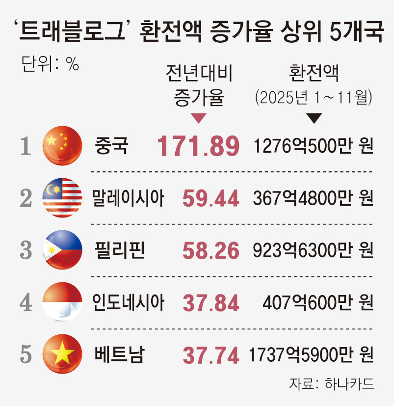 9일 본보가 하나카드에 의뢰해 국내에서 가장 많이 쓰는 여행 카드 ‘트래블로그’의 국가별(12개국) 환전액·이용액을 분석한 결과 올해 1~11월 환전액은 2조3362억 원으로 전년 동기(1조8865억 원) 대비 23.8% 증가했다. 이 기간 환전액은 일본(7379억 원)으로 가장 많았고, 미국(2849억 원), 유럽(2323억 원), 베트남(1738억 원), 중국(1276억 원)이 뒤를 이었다.