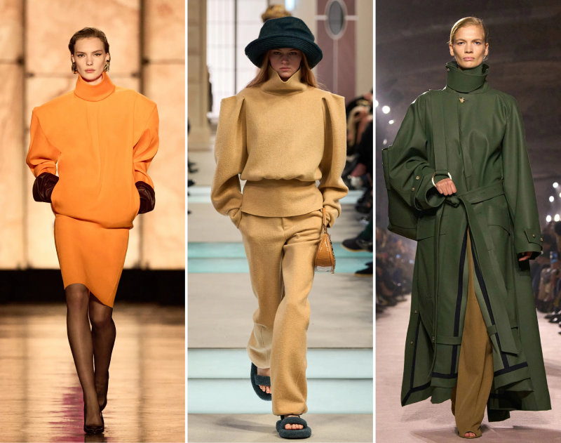 올겨울 패션 하우스들은 다양한 하이넥 실루엣을 선보이고 있다. 생 로랑은 직선으로 곧게 뻗은 어깨선과 턱끝까지 차오르는 하이넥 의상을 컬렉션 전면에 내세웠고(왼쪽 사진) 루이뷔통(가운데 사진)과 빅토리아 베컴(오른쪽 사진)도 다양한 소재의 하이넥 의류를 올해 가을·겨울 컬렉션에 선보였다. 각 브랜드 제공