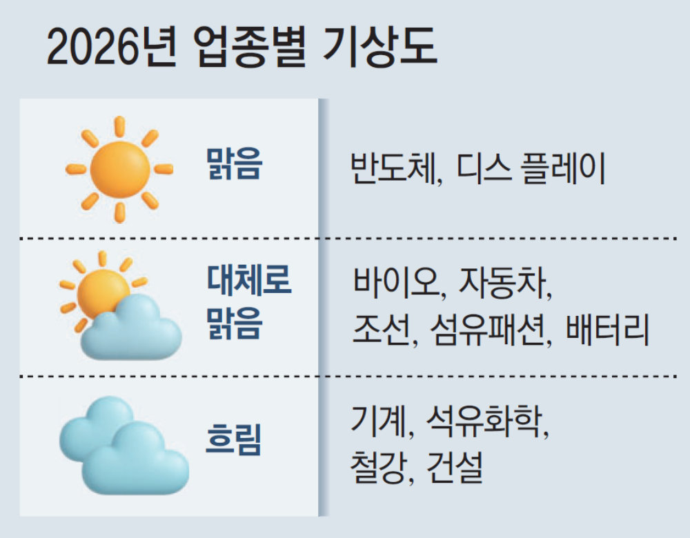 14일 대한상공회의소는 11개 주요 업종별 협회와 함께 분석한 ‘2026 산업 기상도’를 발표했다. 조사에 따르면 반도체와 디스플레이 산업은 ‘맑음’, 배터리와 바이오, 자동차, 조선, 섬유패션 산업은 ‘대체로 맑음’으로 전망됐다. 기계와 석유화학, 철강, 건설 산업의 전망은 ‘흐림’으로 예상된다.