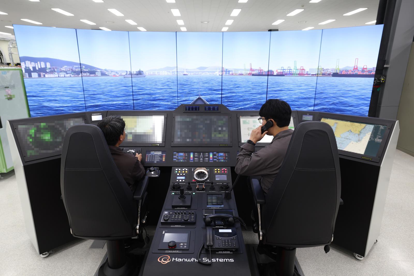12일 방문한 경북 구미시 한화시스템 신사업장. 본관을 포함한 총 5개 건물 중 가장 큰 제조동 건물 3층에 들어서자 비행기 조종석과 비슷하게 생긴 시뮬레이션 장비가 눈에 들어왔다. 한화시스템이 국내 최초로 개발 중인 항공기 콕핏형 통합함교체계(IBS)다. 기존에 조타, 통신, 항법 등 6~8명이 나눠 수행해야 하던 함교 업무를 항공기처럼 단 두 명이 운용할 수 있도록 손이 닿는 곳에 모든 기능과 화면을 모아놓은 함정 통제 장치다.