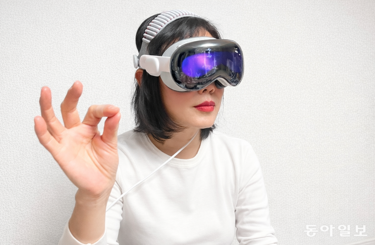 애플이 11월 한국에 출시한 비전프로(M5 칩 탑재 모델)를 쓴 채 손가락을 집어 감상할 영상을 선택하고 있는 주부 최민선 씨. 최 씨는 “사막을 걷는 영상을 틀었는데, 현장감이 너무 생생한 나머지 방 안에 있는 걸 깜빡하고 모래를 만져보고 싶어서 손을 뻗어 바닥을 만지기도 했다”고 체험 소감을 밝혔다. 애플에 따르면 기존 비전프로보다 M5 칩 탑재 모델은 전반적인 구동 속도가 더 빠르고 작동이 부드럽다. 이민아 기자 omg@donga.com