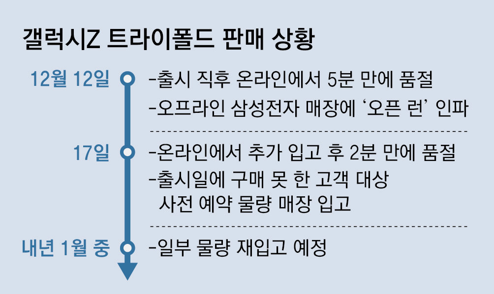 이날 삼성전자 오프라인 매장에도 재입고 물량이 일부 들어왔지만, 이는 12일 출시 당일 매장을 방문했으나 구매하지 못한 고객을 위한 사전 발송 예약 제품이었다. 삼성전자는 이날도 매장에 왔지만 트라이폴드를 사지 못하고 돌아간 고객들에게 예약 순번을 부여했다. 내년 1월에 추가 물량이 입고되면 이들이 먼저 살 수 있게 할 예정이다.