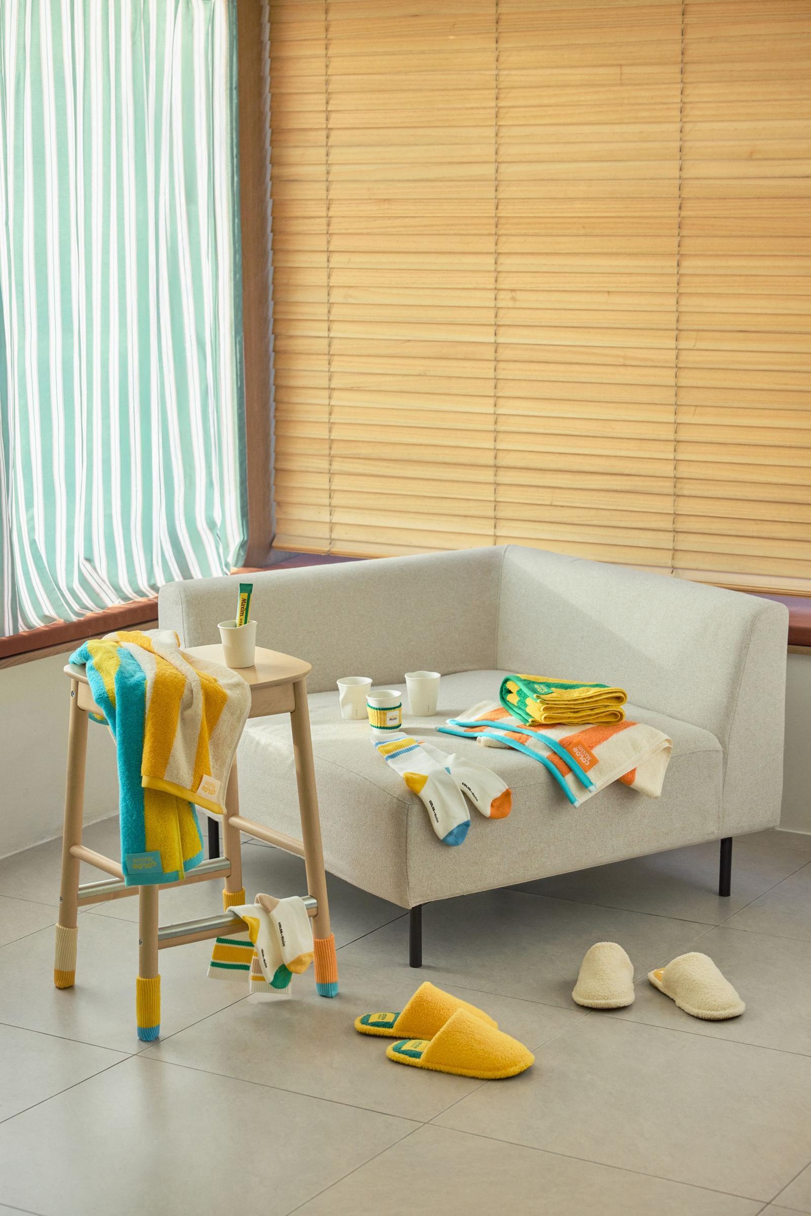 컬러 오브 맥심 한정판 패키지. 굿즈 아이템은 타월, 슬리퍼, 의자 커버, 컵 등 일상 속에서 자주 사용하는 아이템들로 구성했다.