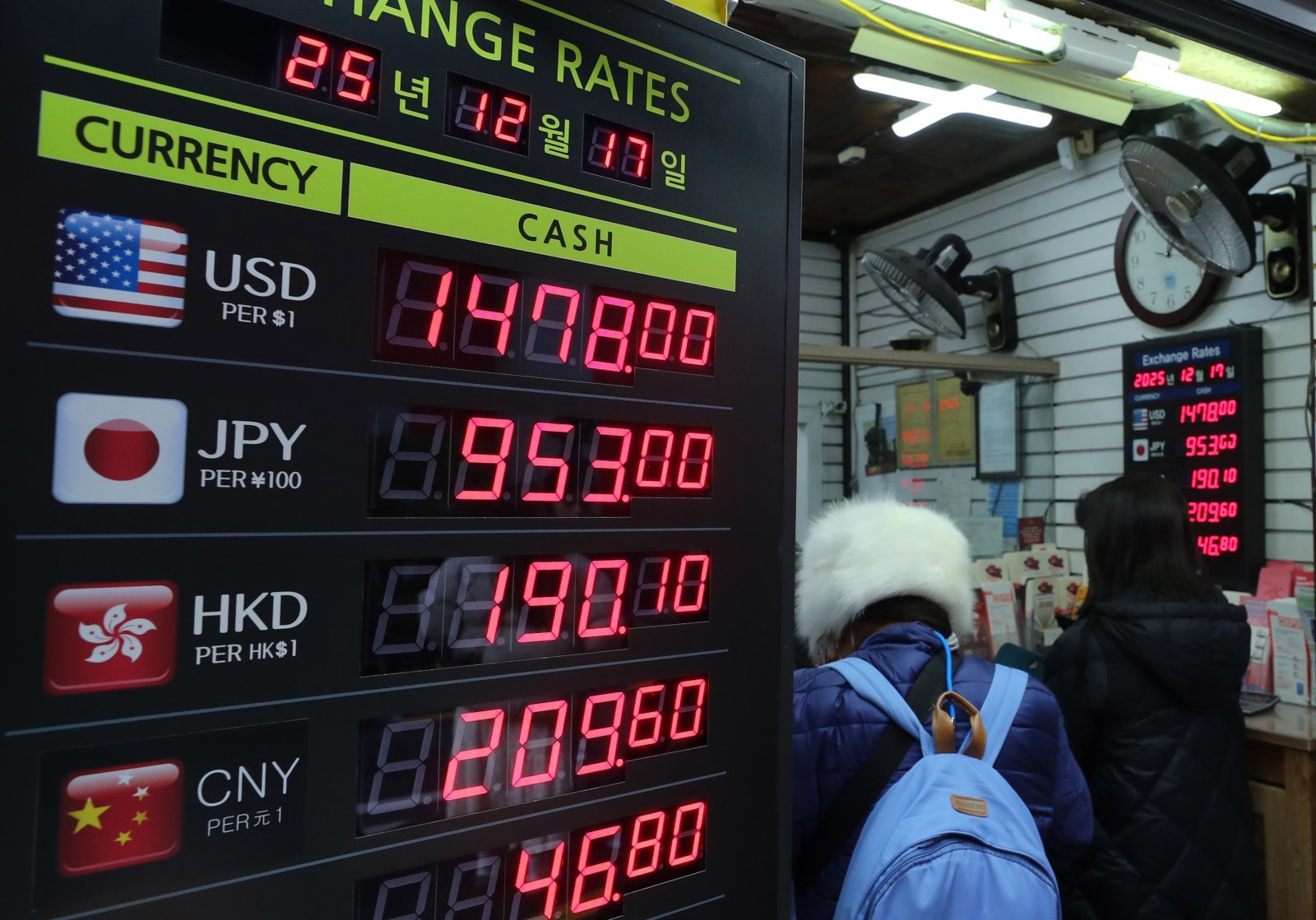 원·달러 환율이 장중 1480원을 돌파하며 8개월 만에 최고 수준으로 오른 17일 서울 중구 명동의 한 환전소에 거래 가격이 표시돼 있다. 2025.12.17 [서울=뉴시스]