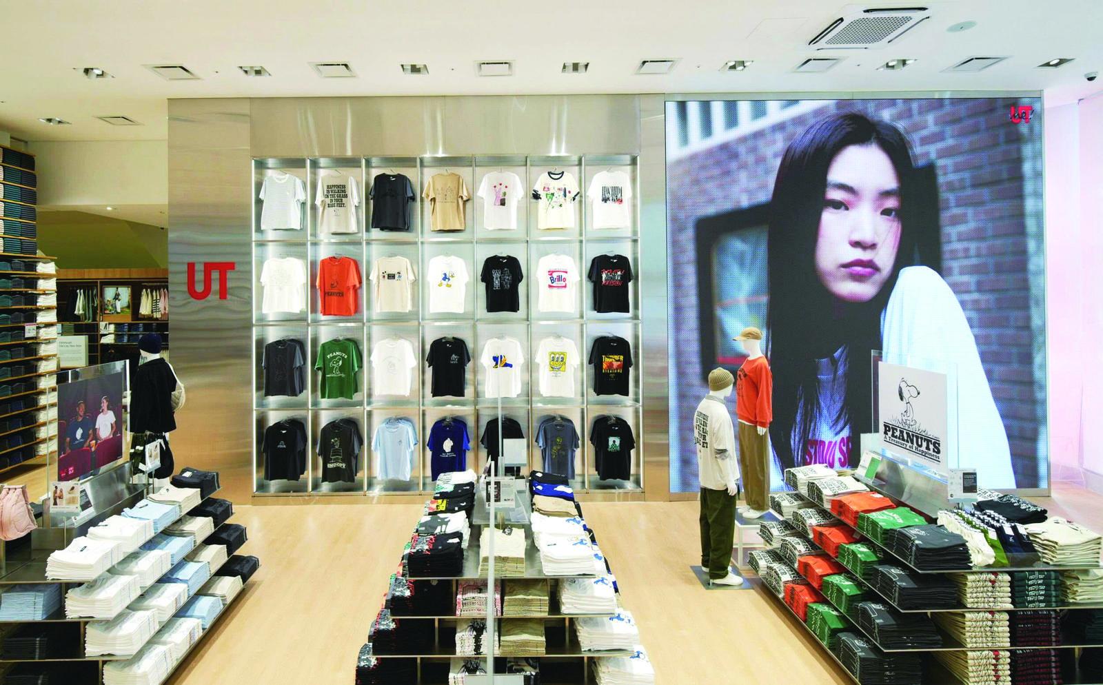 서울 송파구 유니클로 롯데월드몰점에 설치한 그래픽 티셔츠 큐레이션 공간 ‘UT존’. 이곳의 ‘유티미(UTme!)’ 코너는 800여 종의 스티커를 조합해 나만의 티셔츠를 제작할 수 있도록 하고 있다. 유니클로 제공