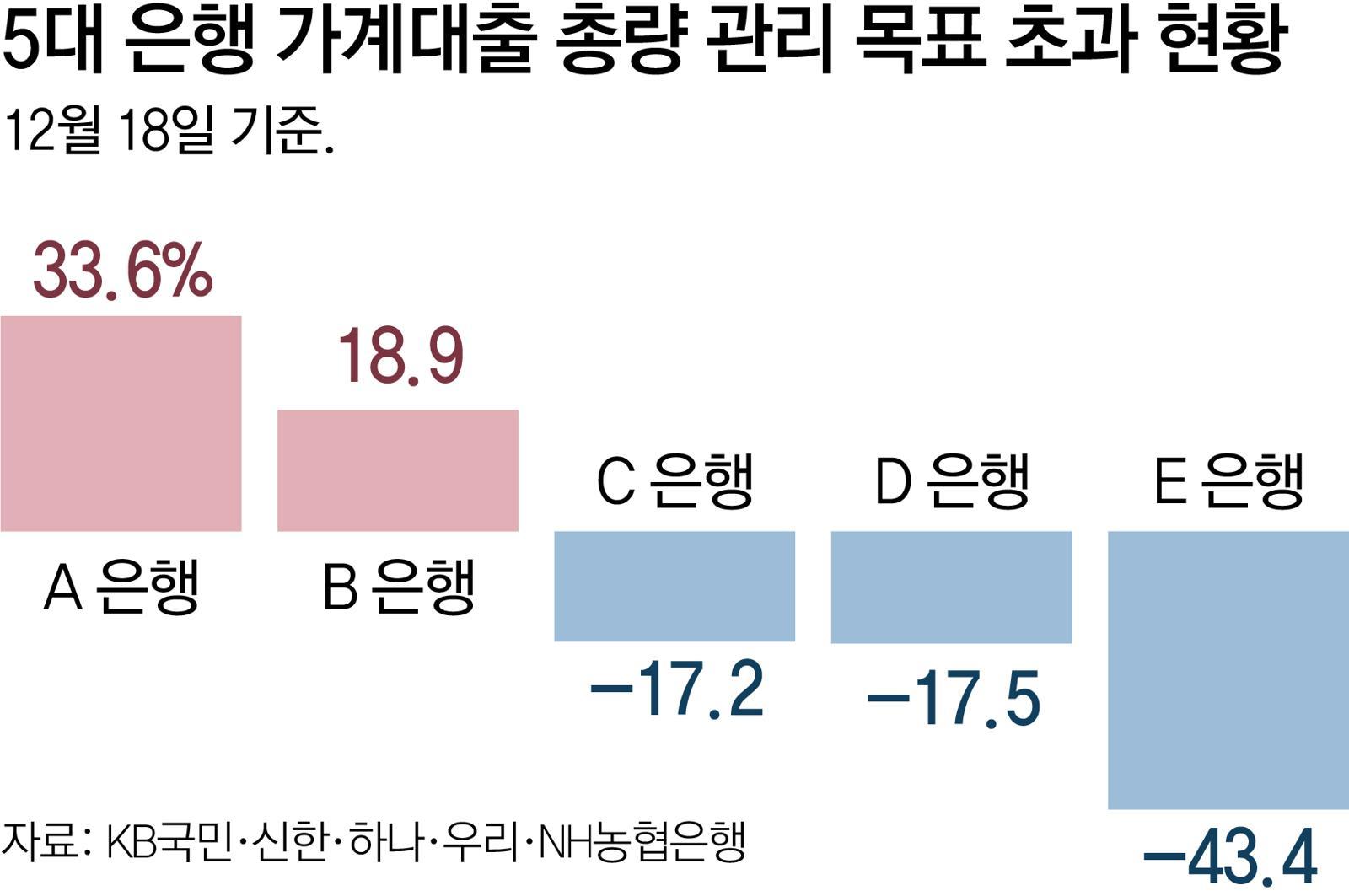 이에 따라 5대 은행(KB국민·신한·하나·우리·NH농협은행)에서 올 초부터 이달 18일까지 늘어난 가계대출(정책대출 제외)은 총 7조4685억 원으로 올 초 제출한 증가액 한도 목표(8조690억 원)보다 7.4%(6005억 원) 줄어들었다. 올해는 불과 8영업일 남은 상황이어서 5대 은행 합산 기준 목표치를 밑돌 가능성이 높다. 정부의 가계대출 관리가 엄격해지면서 은행들이 더욱 가계대출을 조인 탓이다.