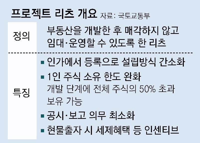리츠는 다수 투자자로부터 자금을 모아 부동산에 투자한 후 발생한 수익을 나누는 회사를 말한다. 기존에는 리츠로 오피스 등 부동산을 직접 개발·운영하려면 인가, 공시 등 규제가 많아 특수목적법인(PFV)을 세워 분양하는 경우가 많았다. 이 때문에 시행사가 분양 수익을 거두고 나면 사업에서 손을 떼 안정적인 운영보다는 단기 수익 중심으로 사업이 추진된다는 비판이 많았다. 이에 정부는 관련 법령을 정비해 리츠로 부동산 개발 뒤 운영까지 가능하게 하고 세제 혜택 등 인센티브도 주도록 했다.