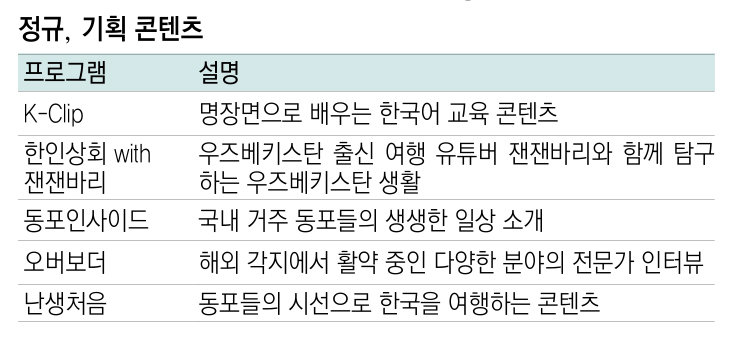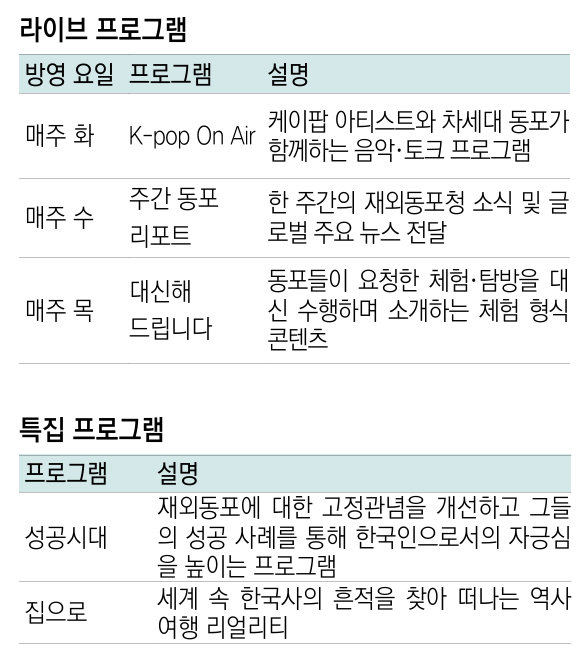 전 세계 주요 동포 거주 지역의 프라임타임에 맞춰 시청함과 동시에 재외동포가 직접 참여하는 쌍방향 소통형 플랫폼으로도 운영된다. 재외동포 콘텐츠 공모전 실시 및 수상작 송출, 글로벌 재외동포 인플루언서와의 협업 콘텐츠 제작 등을 통해 콘텐츠 생산 과정에 참여하도록 지원할 예정이다. 유튜브 커뮤니티 게시판을 통해 동포 사회 간, 동포 사회와 동포청 간의 소통을 확대하는 등 참여형 플랫폼으로 운영할 방침이다.