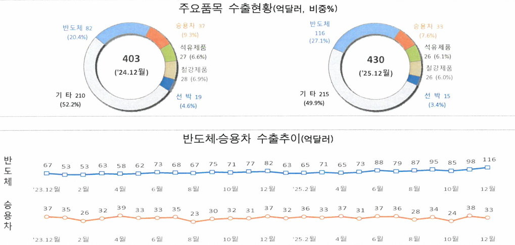 지난 해 같은 기간 대비 반도체(41.8%)와 무선통신기기(17.8%)가 큰 폭으로 늘었고, 승용차와 석유제품은 각각 12.7%, 1.0%감소했다. 반도체의 수출비중은 27.1%로 6.7%p 증가했다.