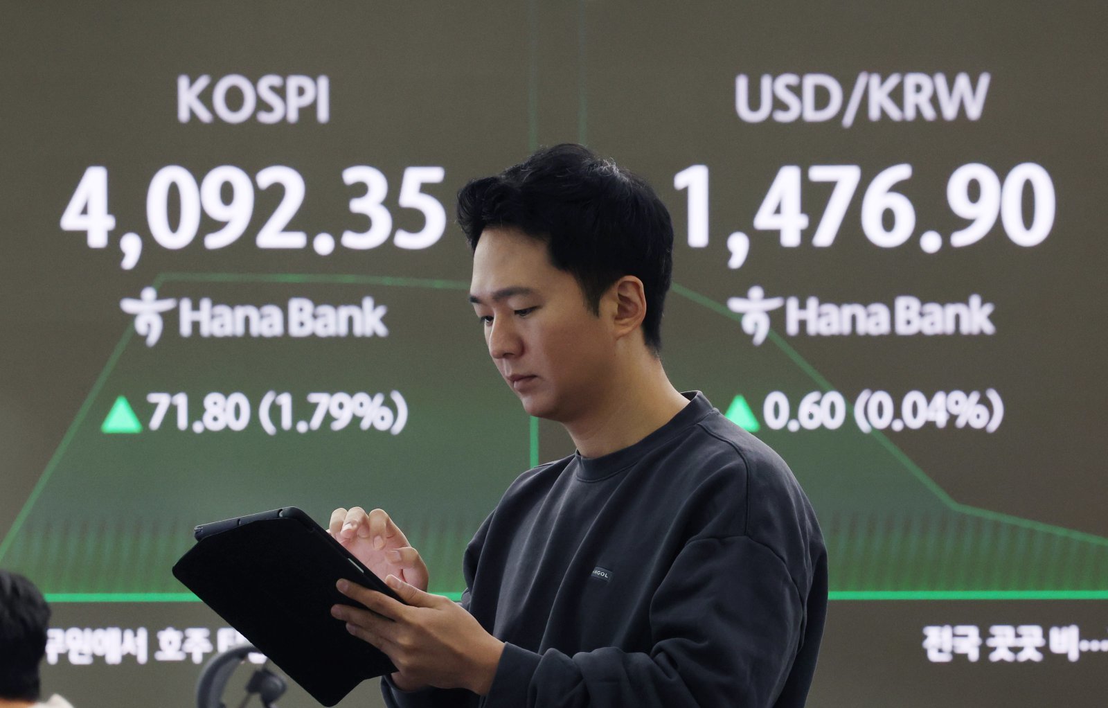22일 서울 중구 하나은행 딜링룸에서 딜러들이 업무를 보고 있다. 코스피는 전 거래일(4020.55)보다 75.71포인트(1.88%) 상승한 4096.26에, 코스닥 지수는 전 거래일(915.27)보다 8.70포인트(0.95%) 오른 923.97에 거래를 시작했다. 서울 외환시장에서 원·달러 환율은 전 거래일 주간거래 종가(1476.3원)보다 0.3원 오른 1476.6원에 출발했다. 2025.12.22. [서울=뉴시스]