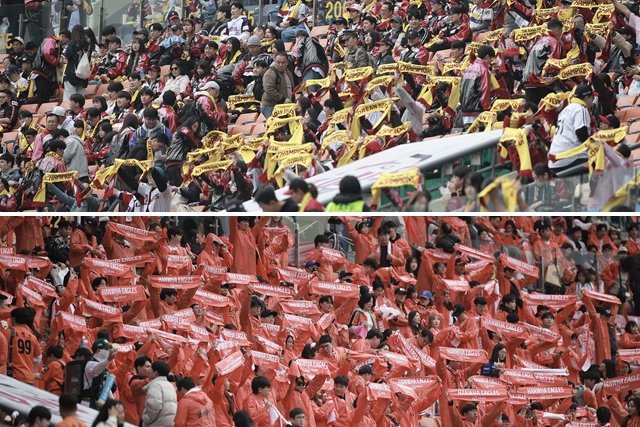 한국시리즈 1차전에서 각 팀을 응원 중인 LG(위), 한화 팬들. 뉴시스