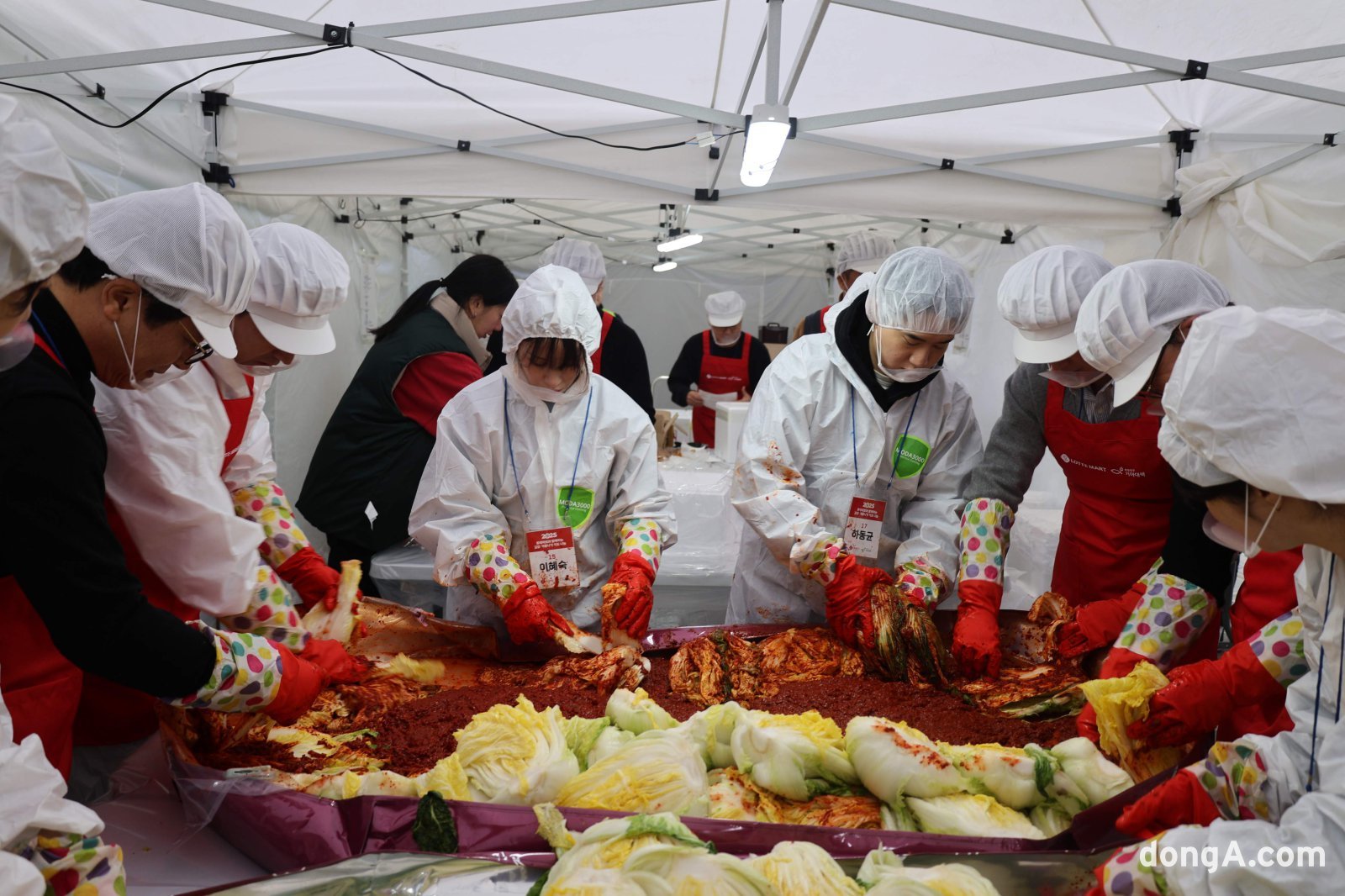지난 19일 서울시 송파구 문정노인종합복지관에서 열린 ‘사랑의 김장 나눔’ 행사에서 롯데마트 임직원들이 취약계층에 전달할 김장 김치를 담그고 있다. 이번 행사는 임직원들이 자발적으로 기부한 ‘끝전 기부금’으로 마련됐다.
