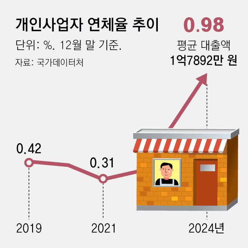 국가데이터처가 22일 발표한 ‘개인사업자 부채(잠정)’ 통계에 따르면 지난해 12월 말 기준 개인사업자 평균 대출은 1억7892만 원으로 전년보다 30만 원(―0.2%) 줄며 2년 연속 감소했다. 반면 지난해 연체율(대출 잔액 기준)은 0.98%로 전년(0.65%)보다 0.33%포인트 오르며 2년 연속 최고치를 경신했다. 절대적인 연체율 수준과 상승 폭 모두 2017년 통계 집계 이래 역대 최대다. 연체율은 전체 대출 금액 중 3개월 이상 상환되지 못한 연체액의 비율을 의미한다.