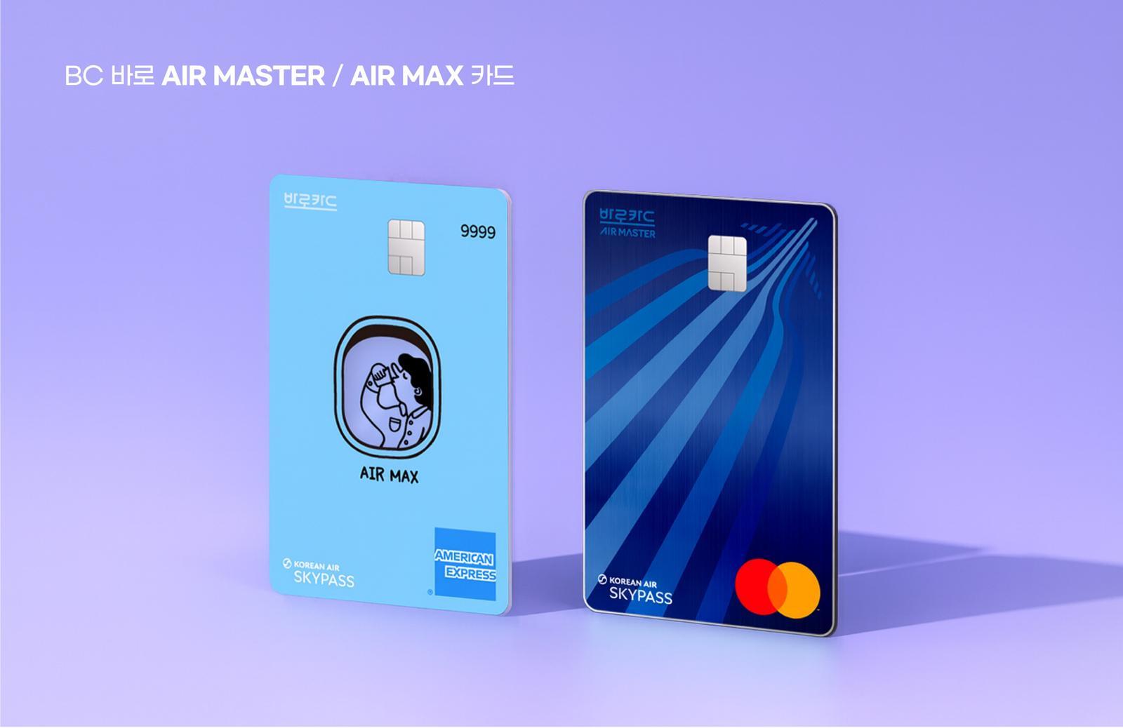 BC카드가 대한항공 마일리지 특화 ‘에어 마스터’(오른쪽)와 ‘에어 맥스’ 카드 2종을 출시했다. BC카드 제공