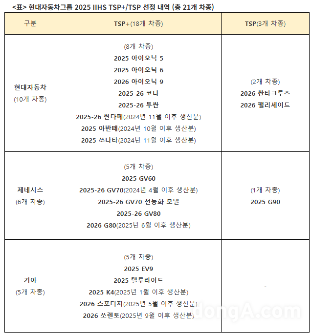 또한 ‘TSP+’ 등급 획득 조건이 엄격해져, 전면 및 측면 충돌 테스트에서 모두 ‘훌륭함(Good)’을 받아야 하고, 전조등 및 보행자 충돌방지 시스템에서도 일정 수준 이상의 평가를 충족해야 한다. 현대차그룹은 모든 요건을 충족했으며 한층 강화된 기준 속에서도 안정적인 성과를 이어갔다.