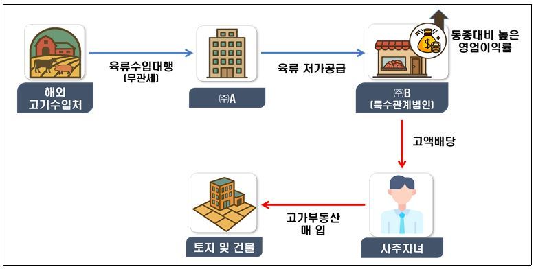 조사 대상 업체들은 사주의 자녀가 운영하는 특수관계법인을 유통과정 중간에 끼워 넣고 관세 감면을 받은 원재료를 낮은 가격에 공급하는 등 부당하게 이익을 나눈 것으로 조사됐다. 또 특수관계법인에게 할당관세 적용 품목 수입과 관련된 선적·물류·통관 등 업무를 대신 처리해 주면서 관련 수입대행 용역을 과세가 아닌 면세로 신고해 부가가치세를 탈루한 것으로 파악됐다.
