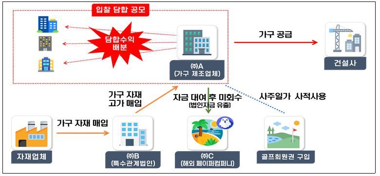 조사 대상 업체는 담합 업체들과 사다리 타기, 제비 뽑기 등을 통해 낙찰 순번을 정해 나눠 먹기식 수주를 하면서 들러리 업체에게 입찰 포기에 대한 대가로 공사 계약 금액의 10%에 달하는 금액을 사례금으로 지급하고 거짓 세금계산서를 수취한 것으로 조사됐다.