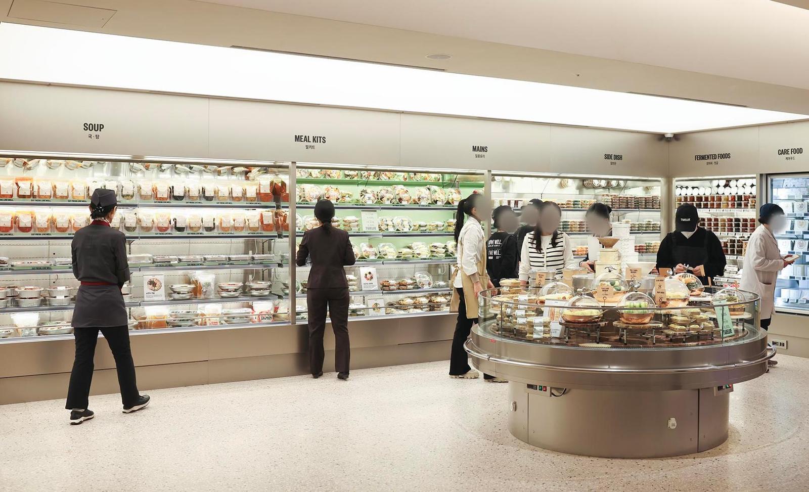서울 강남구 청담동에 문을 연 ‘하우스오브신세계 청담’ 식품관 ‘트웰브’의 ‘홈밀’ 코너에서 방문객들이 밀키트와 장아찌, 국 등을 둘러보고 있다. 신세계백화점 제공