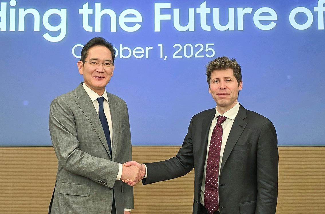 이재용 삼성전자 회장이 10월 삼성전자 서초사옥에서 열린 ‘글로벌 AI 핵심 인프라 구축을 위한 상호 협력 의향서(LOI) 체결식’ 당시 샘 올트먼 오픈AI 대표와 악수를 나누고 있다.