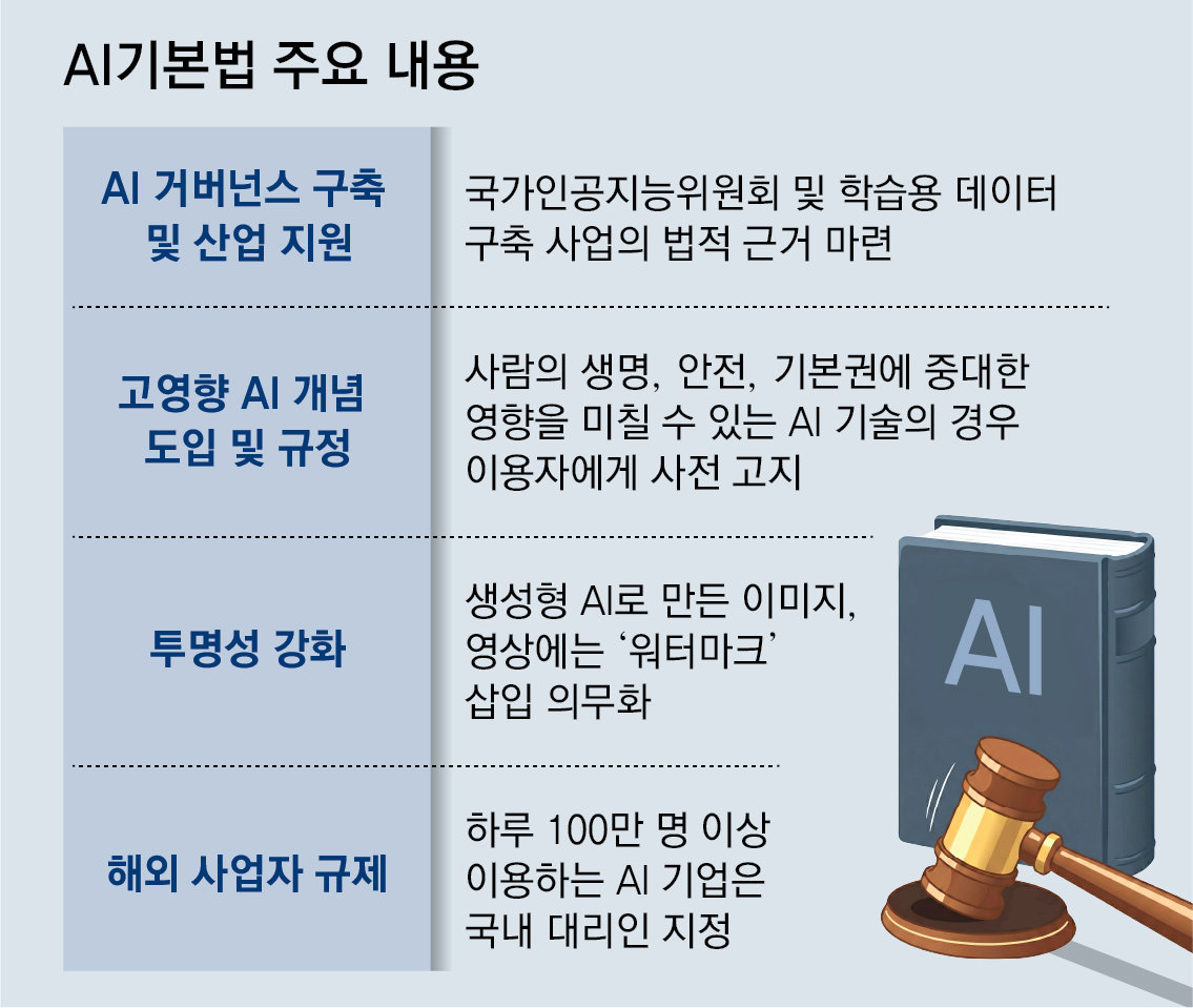 정부가 ‘인공지능(AI) 발전과 신뢰 기반 조성 등에 관한 기본법(AI기본법)’ 시행을 약 한 달 앞두고 해당 법 가운데 기업 규제에 대해서만 1년 유예하기로 했다. 정부는 추가 유예 가능성을 언급하면서 “AI기본법은 ‘진흥’ 법”이라고 강조했다.