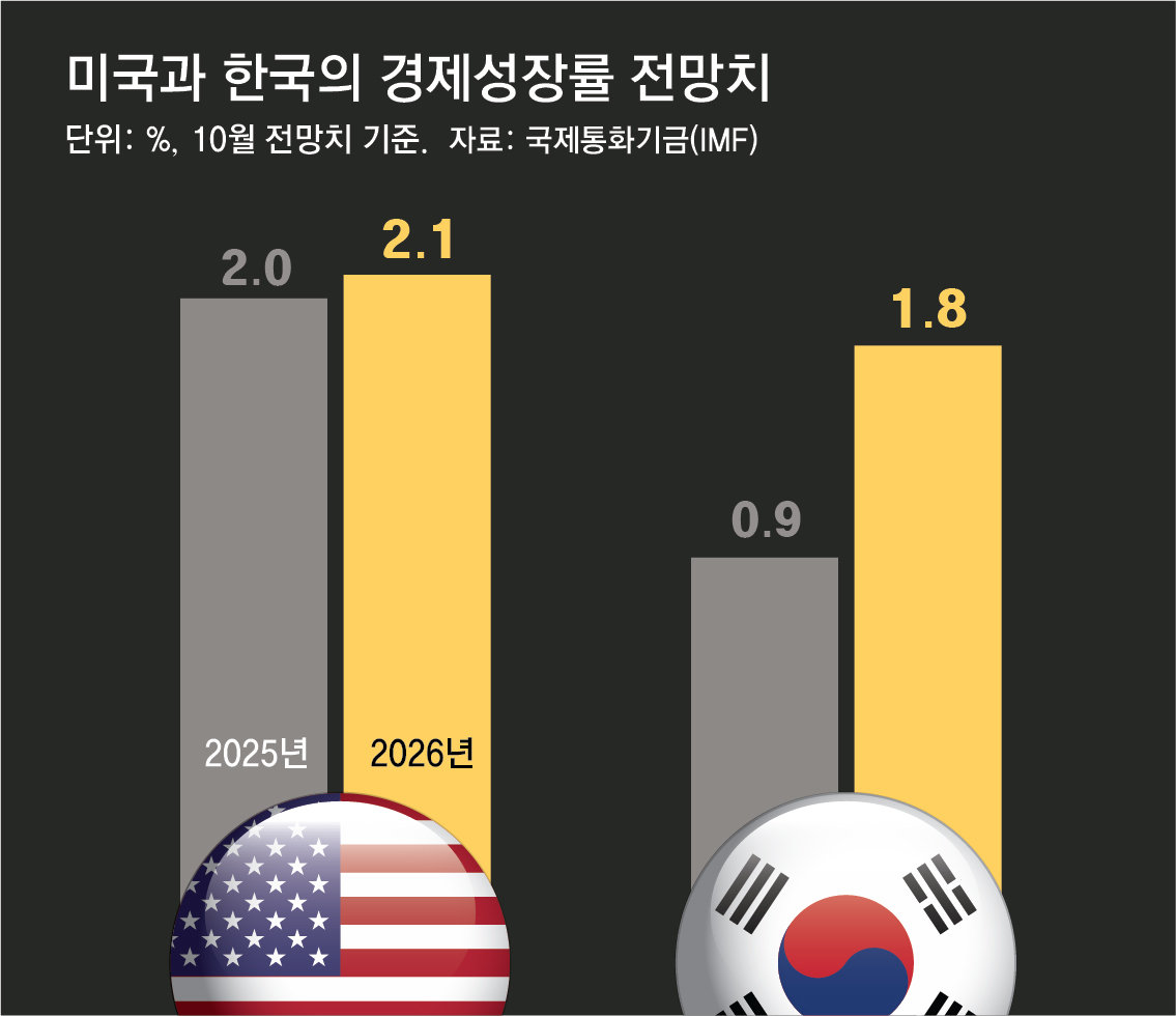 이렇게 되면 미국은 3년 연속 한국의 경제성장률을 앞지를 수 있다. IMF는 한국의 올해 경제성장률 전망을 0.9%로 봤다. 미국 경제는 2023년에는 2.9%, 2024년에는 2.8%로 견조한 성장세를 이어왔다. 반면 한국 경제는 2023년에 1.4%, 2024년에는 2.0% 성장하며 미국보다 열세였다.