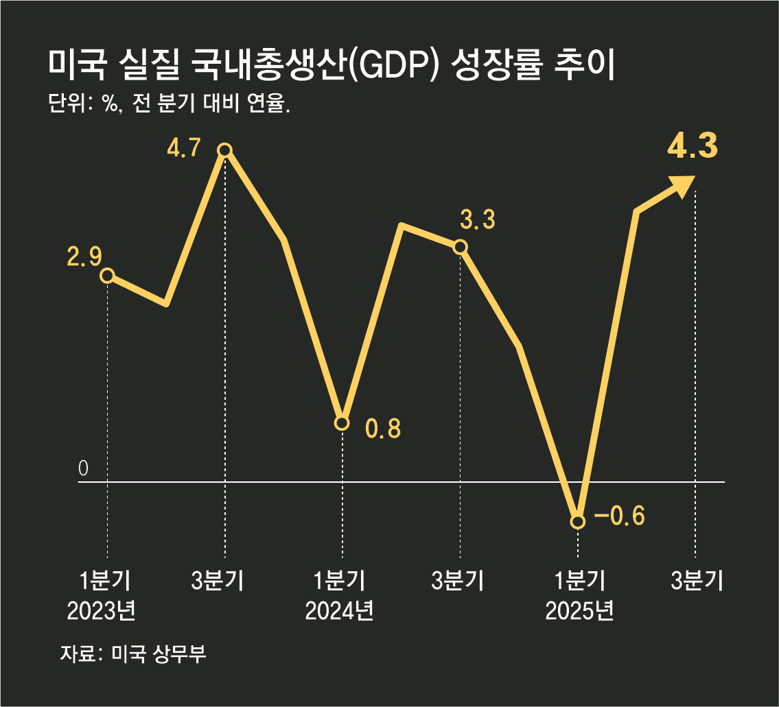 미국 상무부는 3분기 미국의 국내총생산(GDP) 증가율이 4.3%(전기 대비 연율)로 집계됐다고 23일(현지 시간) 밝혔다. 이는 분기 기준으로 2023년 3분기(4.7%) 이후 2년 만에 가장 높은 성장률이다. 다우존스가 집계한 전문가 전망치(3.2%)도 훌쩍 뛰어넘었다. 해당 분기 실적이 1년간 계속 이어지는 것을 가정한 연율 계산을 뺀 전 분기 대비 성장률은 약 1.1%다.
