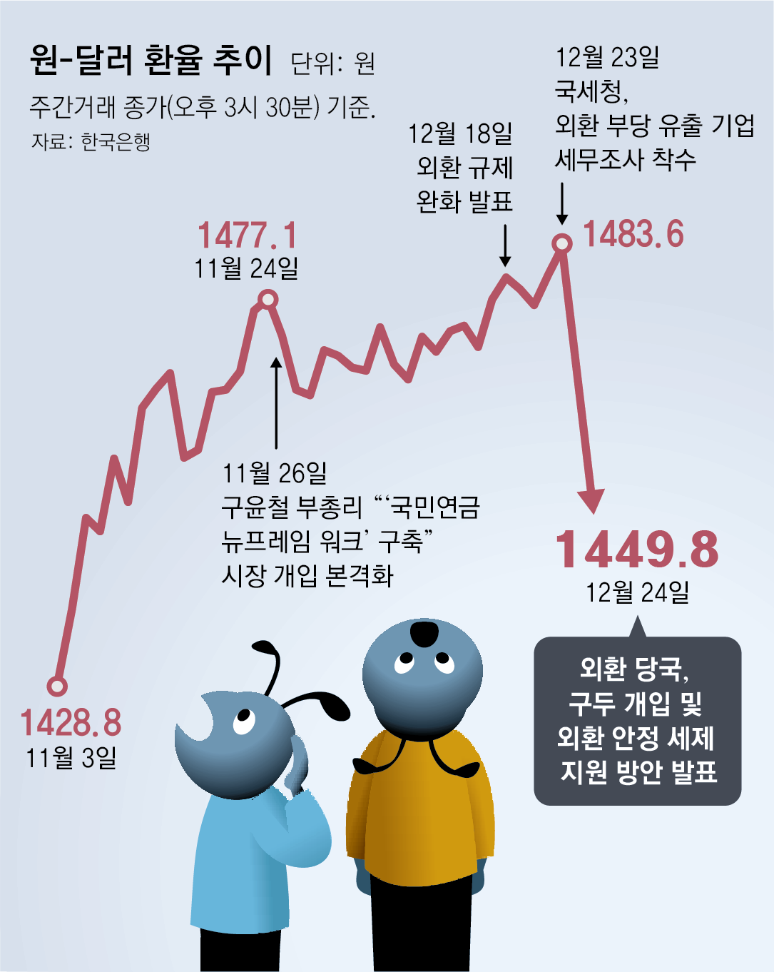 이날 발표된 대책과 관련해 시장에서는 단기적으로 서학개미의 국내 복귀를 이끌 수 있을 것이란 전망이 나온다. 서정훈 하나은행 수석연구위원은 “원-달러 환율이 1480원에 이르자 정부가 강력한 대책을 내놨는데 이것이 시장에 상한선은 1480원이라는 인식을 확실히 줄 수가 있을 것”이라고 말했다. 실제로 이날 원-달러 환율은 33.8원 내린 1449.8원에 주간 거래를 마쳤다.