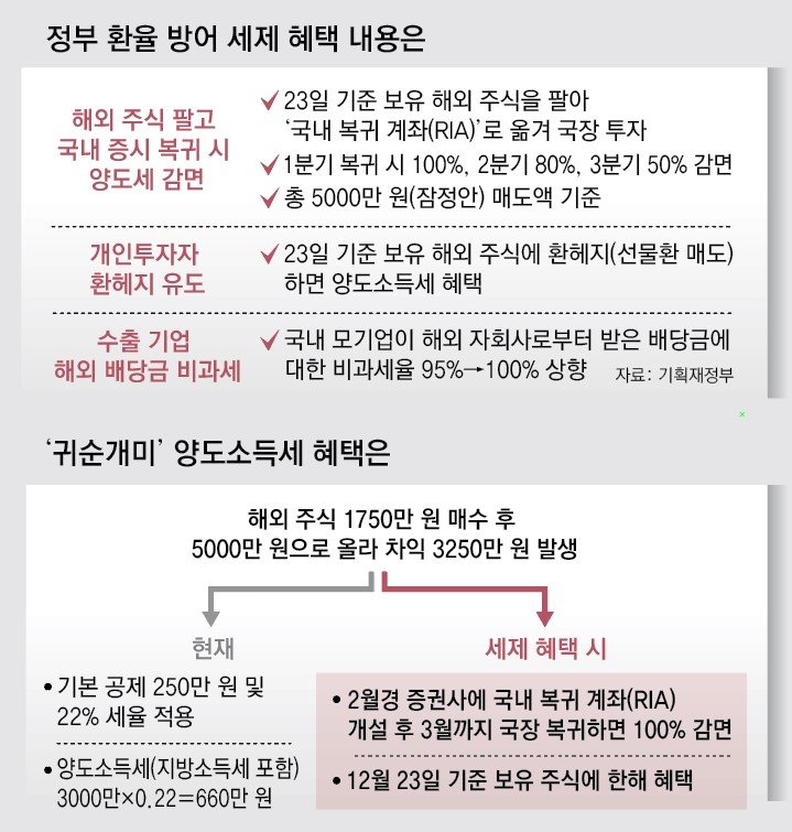 정부는 또 개인투자자용 선물환 상품을 도입하고, 23일까지 보유한 해외 주식에 대해 환헤지(선물환 매도)를 할 경우 매입액의 5%(최대 500만 원)를 해외 주식 양도세 계산 시 추가 공제로 인정하기로 했다. 개인별 환헤지 인정 한도는 연평균 잔액 기준 1억 원이다. 선물환은 앞으로 달러를 팔 환율을 미리 정해 두는 계약으로, 이를 활용하면 주식을 팔지 않고도 환율 변동에 따른 손실을 막는 환헤지가 가능하다.