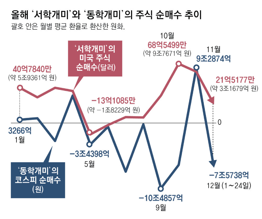 정부가 해외 증시에 투자하는 개인 투자자들의 국내 증시 복귀에 세제 혜택을 내놓은 뒤 ‘서학개미’들이 술렁이고 있다. 국내 증시 유인책이 나와도 미 증시가 연일 최고치를 경신하며 ‘산타랠리’를 벌이자 국내 증시가 대안이 될 수 있을지에 대한 의구심이 여전한 탓이다.