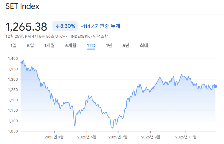 2위는 태국입니다. 태국 증시의 SET 지수는 올해 8% 넘게 하락했죠. 태국은 올해 내내 혼란기를 겪었습니다. 훈센 전 캄보디아 총리와의 통화내용이 유출되면서 패통탄 친나왓 총리가 잘렸고요. 캄보디아와의 국경 분쟁이 촉발한 무력 충돌이 갈수록 확산되면서 ‘준전시 상황’으로 치닫고 있죠.