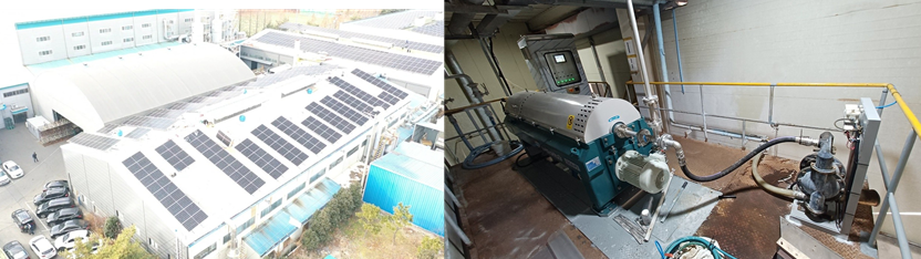 수질오염 저감 분야에서는 섬유상여과기를 도입해 공정에서 발생하는 오염물질을 효과적으로 처리하고 있다. 폐기물 배출 저감 분야에서는 원심탈수기를 설치해 폐기물 발생량을 줄이고 처리 효율을 높였다. 환경안전 분야에서는 작업 현장의 안전성을 강화하기 위해 안전난간대를 설치했다.